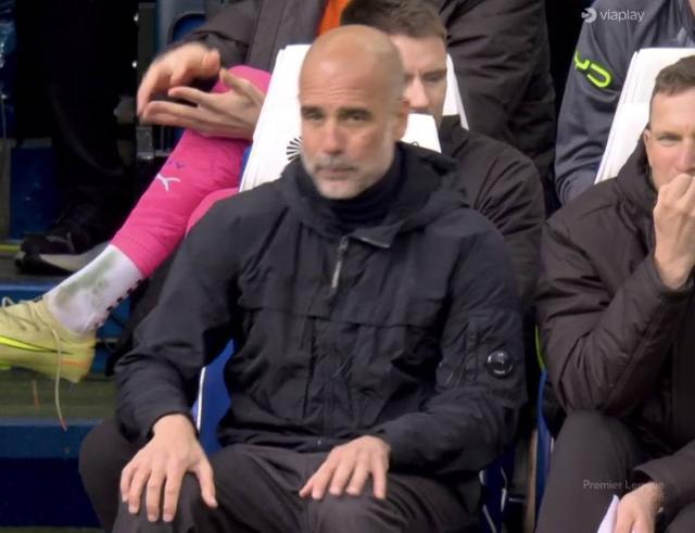 在上半场行将结束时,转播镜头找到了瓜迪奥拉,只见瓜帅坐在教练席,双手放在膝盖上,表情显得闷闷不乐。